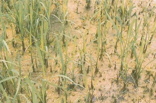 2.稻恶苗病。又称白秆病,系水稻地上部的一种真菌病害。从秧苗期至抽穗期均可发病。病株徒长,瘦弱,黄化,通常比健株高3—10厘米,极易识别。选用无病种子或播种前用药剂浸种是防治的关键措施。