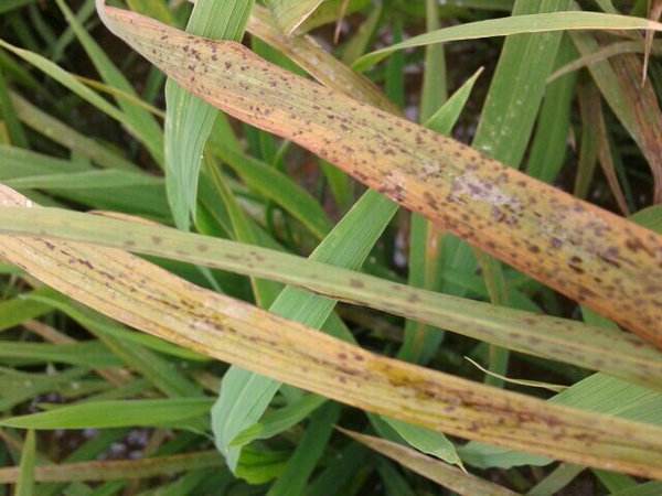 危害外部老叶片,并从叶尖部向下发展,初为褐色水浸状小斑,后扩大为纺锤形或不规则赤褐色条斑,边缘出现黄晕,病斑中心灰褐色,病斑常融合成大条斑,使叶片局部坏死,远观水稻普遍红尖。