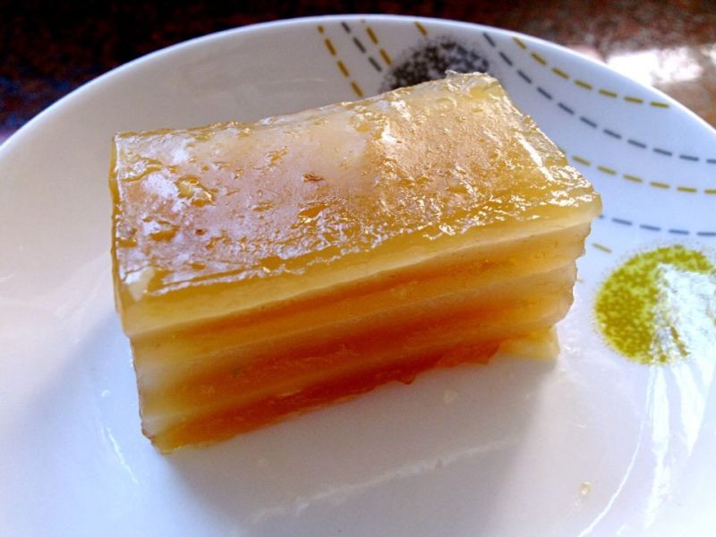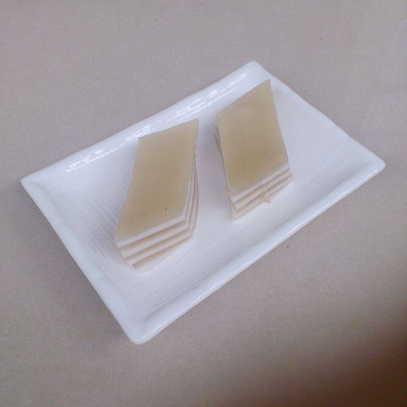 7凝固后的椰汁糕切成自己喜欢的大小即可。如果觉得口味淡的可以蘸一点砂糖吃。